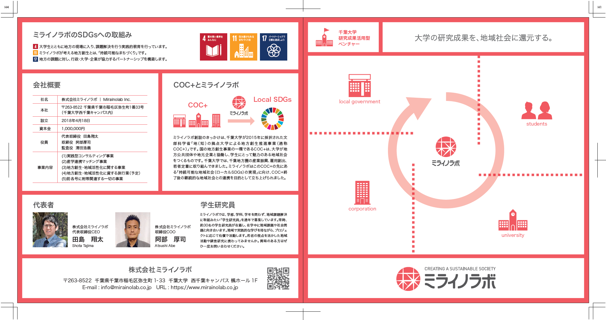 株式会社ミライノラボ様は、千葉大学での地方創生に関する研究を行っていた方たちが、その研究成果を活かすために立ち上げた大学発のベンチャーです。自由区域では、社名のネーミング、ロゴマーク、名刺、会社案内を制作させていただきました。